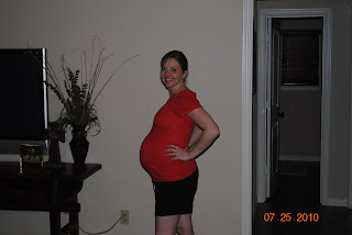 For those of you who have not heard our little man's name is... Porter Kirk Anderson. He is getting big and I'm not sure what he does in there, but I can tell you one thing, he's a pusher and a mover. Not a puncher or kicker. He just rolls around and pushes my skin to it's limits. Jeff was finally able to really feel him moving. Anytime before, when Jeff put his hand on my belly, Porter would stop immediately and not move again until Jeff took his hand off. I have my next appointment on Friday and I'll update you guys again on Sunday. I'll leave you with my 29 week picture. I know I have a while to go, but there are some moments that I don't feel like I can get any bigger.